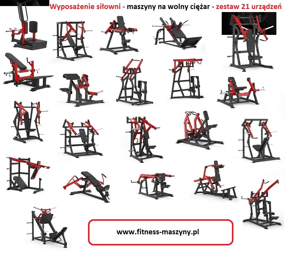 Wyposażenie siłowni - zestaw maszyn na wolny ciężar - 21 urządzeń